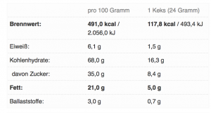 1. Berechne die Energie in einem Keks. Dazu brauchst du die Nährwerttabelle. Haben wir.
